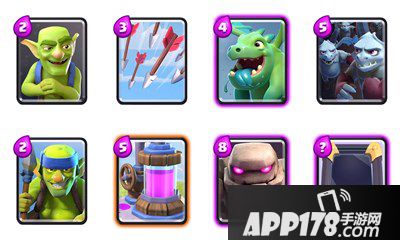 虽然戈仑石人和飞龙宝宝能够有效地镇压战场,但是这两张卡毕竟都不属于输出特别高的单位,所以我们就需要一些小生物来帮助输出了,在所有小生物红这两只移动速度极快的哥布林自然就是我们的首选,特别是近战的哥布林在安全情况下如果能够打到防御塔输出简直爆炸。