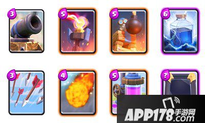 不带火箭的原因是因为这个卡组在使用法术进攻之余,还要兼顾法术的控场,在每一次消耗对手防御塔的时候尽量地带上消耗对手附近的建筑和部队是卡组的制胜手段。雷电法术的使用必须要小心,防止对手在吃了雷电之后展开新一轮的攻击而无法还手,火球则比较奔放,但是伤害确实有点不如人意。