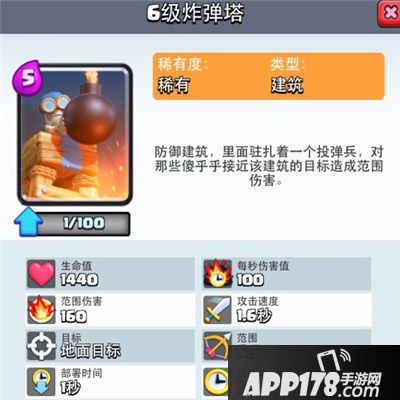 炸弹塔多出47%生命值、30%的持续时间、24%的单次伤害,少了35%的DPS,但是炸弹塔是除了X弩和迫击炮外,攻击距离最远的防御建筑卡牌。