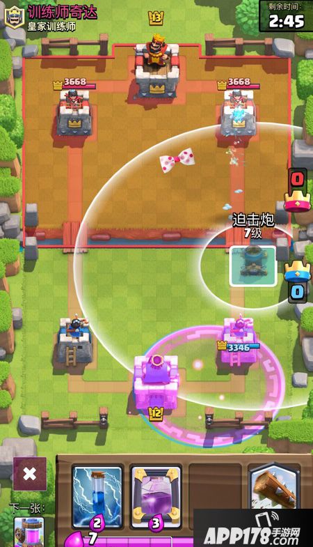 情景-B:当你下了一个炮进攻但是对面有巨人、石头人这一类移动缓慢的前排时,对面通常会选择像情景-A中换路或者在己方公主塔附近(图中蝴蝶结的位置)下兵顶着炮然后推进,如图3所示: