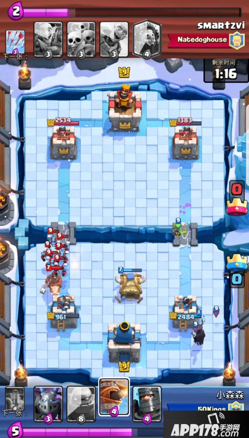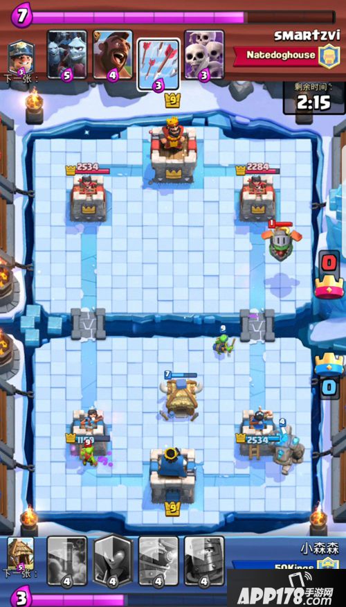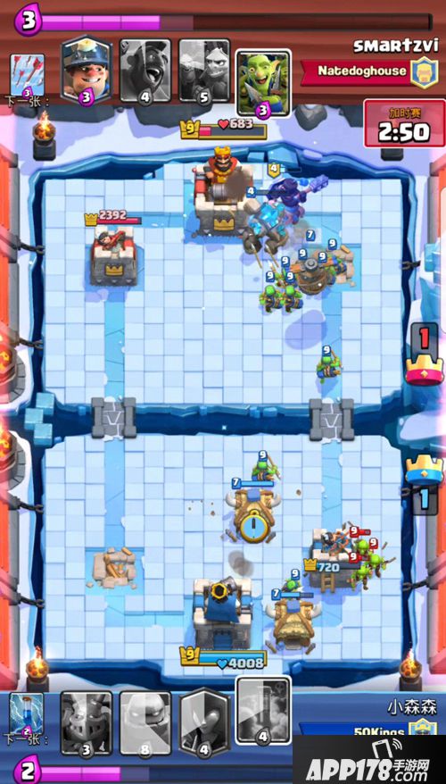 时间已经过去1分钟,我方继续中场偏右放置哥布林小屋,敌方矿工迅速挖过来,但两侧公主塔左右开弓迅速将矿工消灭。
