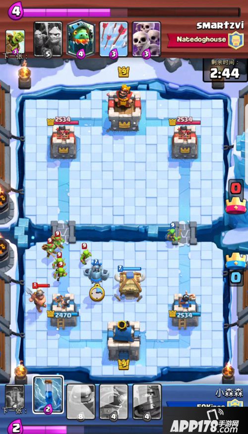 待10费圣水满后,我方率先在中场靠右路的位置放出哥布林小屋,而敌方则从左路发起哥布林团伙搭配矿工的奇袭combo。我方为了保护小屋建筑血量,下出重甲亡灵进行防守,但依旧被敌兵蹭掉不少塔血。