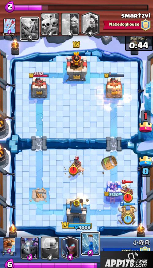 敌方卡组简介:以野猪、矿工配合飞桶组成的飞桶消耗流,能打出矿桶、猪桶等多种消耗combo,此外亡灵大军解场完成后也可以配合矿工发起一波极强悍的反击。