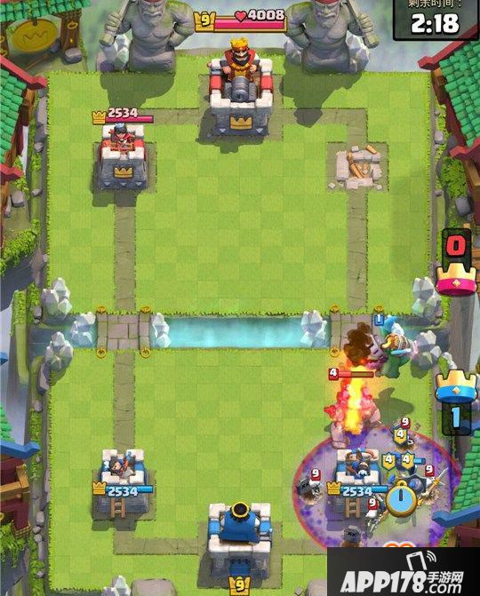 3.我们在进攻时如果对手使用类似三火枪或者法师这些中血量卡牌防守,那么利用火球可以直接让其残血,然后搭配滚木或小电解除,同时还可以消耗敌军防御塔。