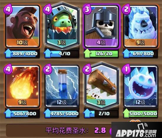 卡组思路:这个卡组在对战中是一个偏高机动性的快攻消耗组合,卡组的平均圣水很低,只需要2.8,并且还具有三法术进行辅助!