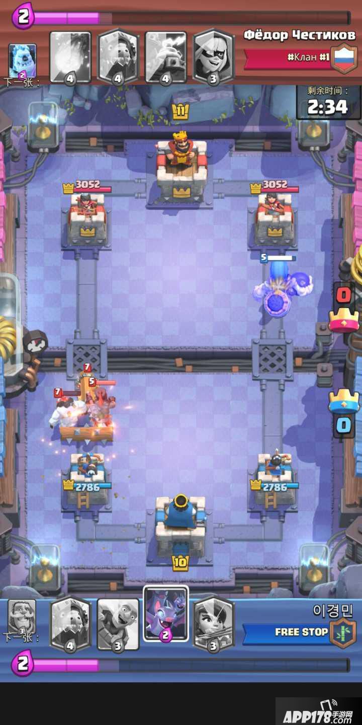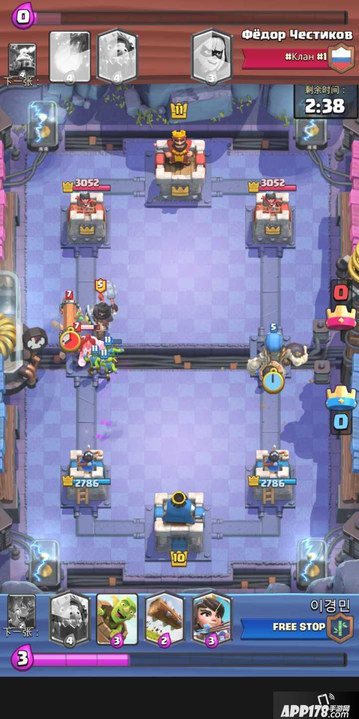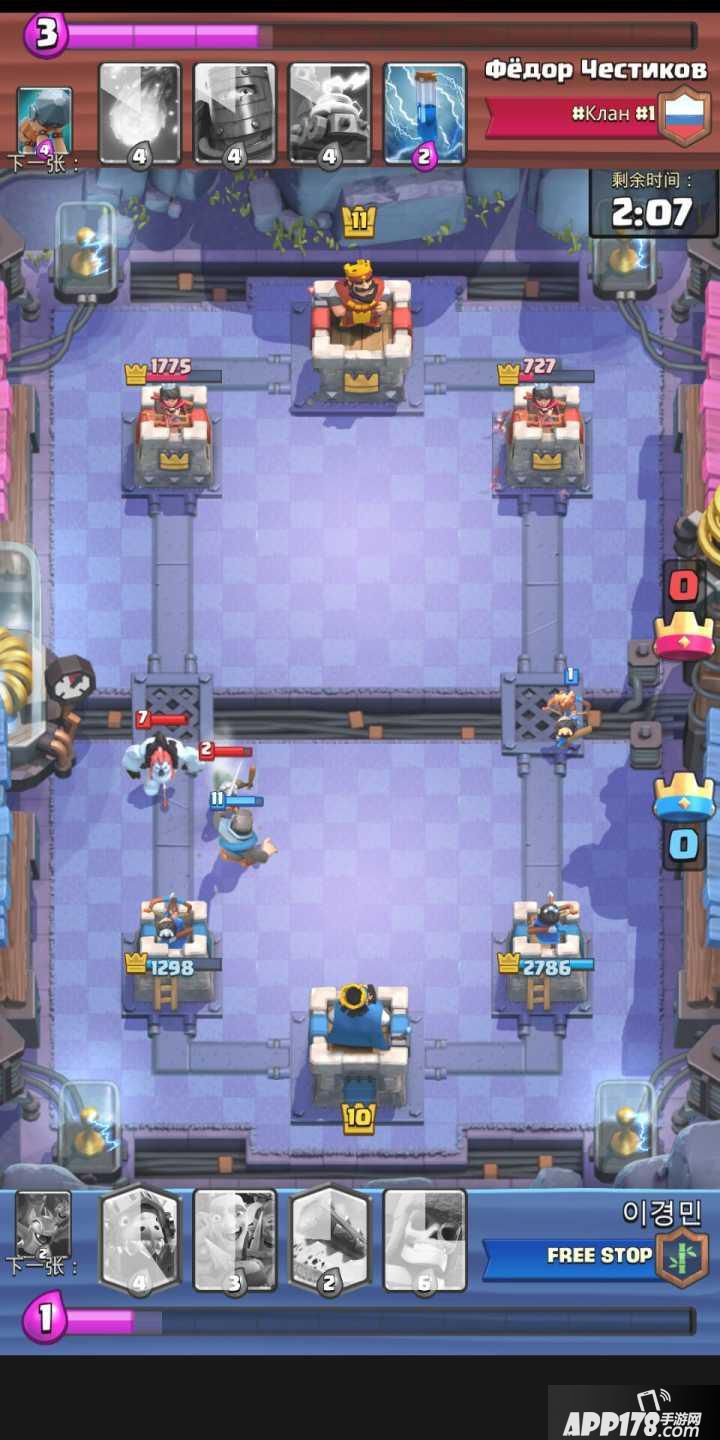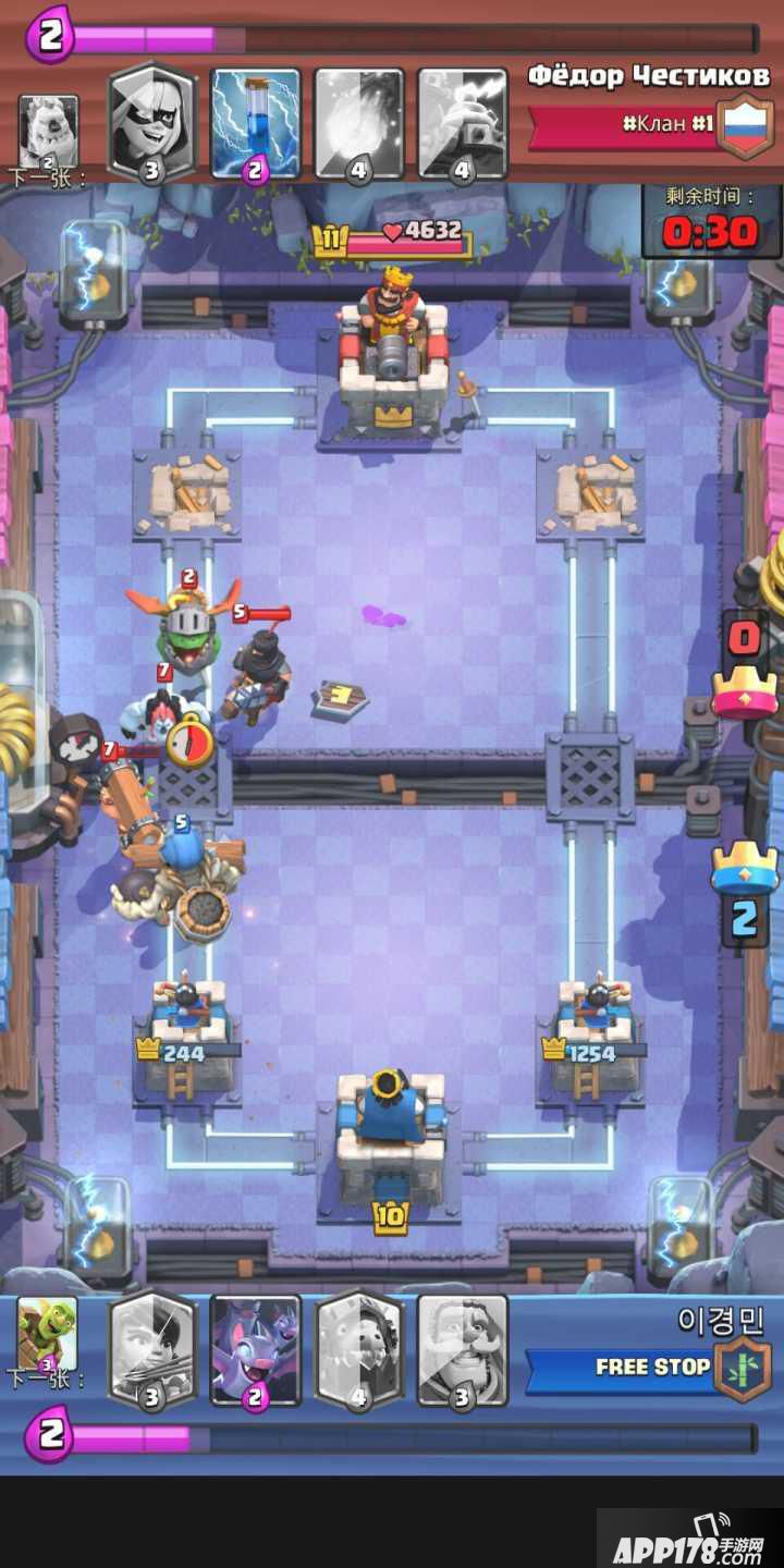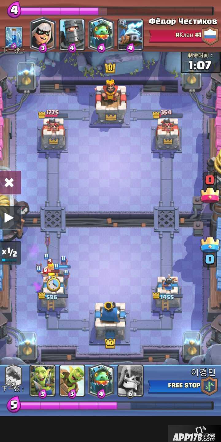 这个时间段对面一直在不停的骚扰我,与其说是骚扰,但是我只要有一次骚扰没有挡下来,我就可能会掉了一个塔,这里已经能推断出对面的卡组是一个十分典型的冲锋三件套黑王加攻城锤加幻影刺客非常的克制我这个卡组