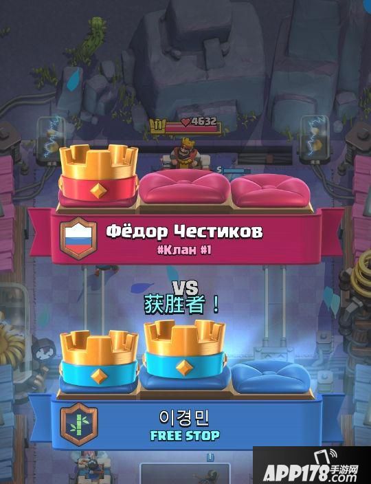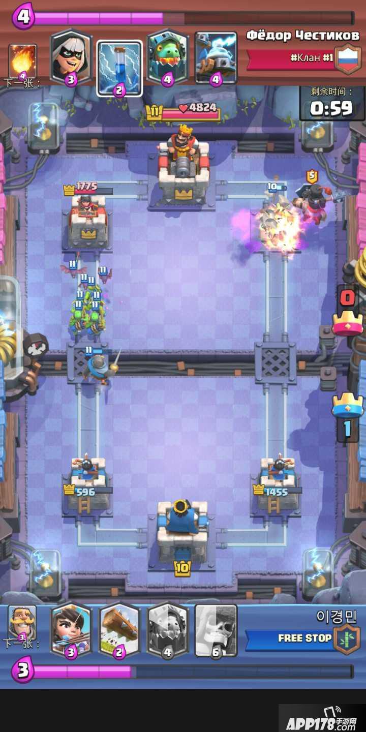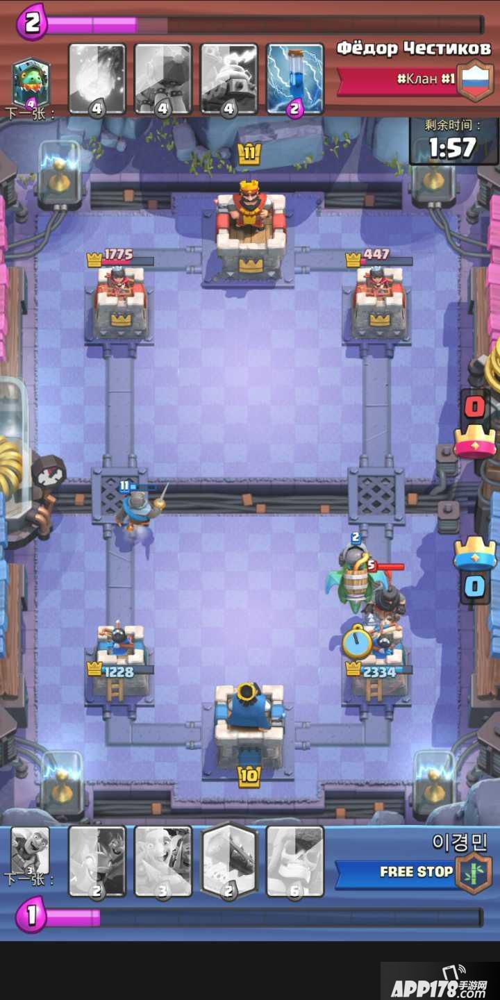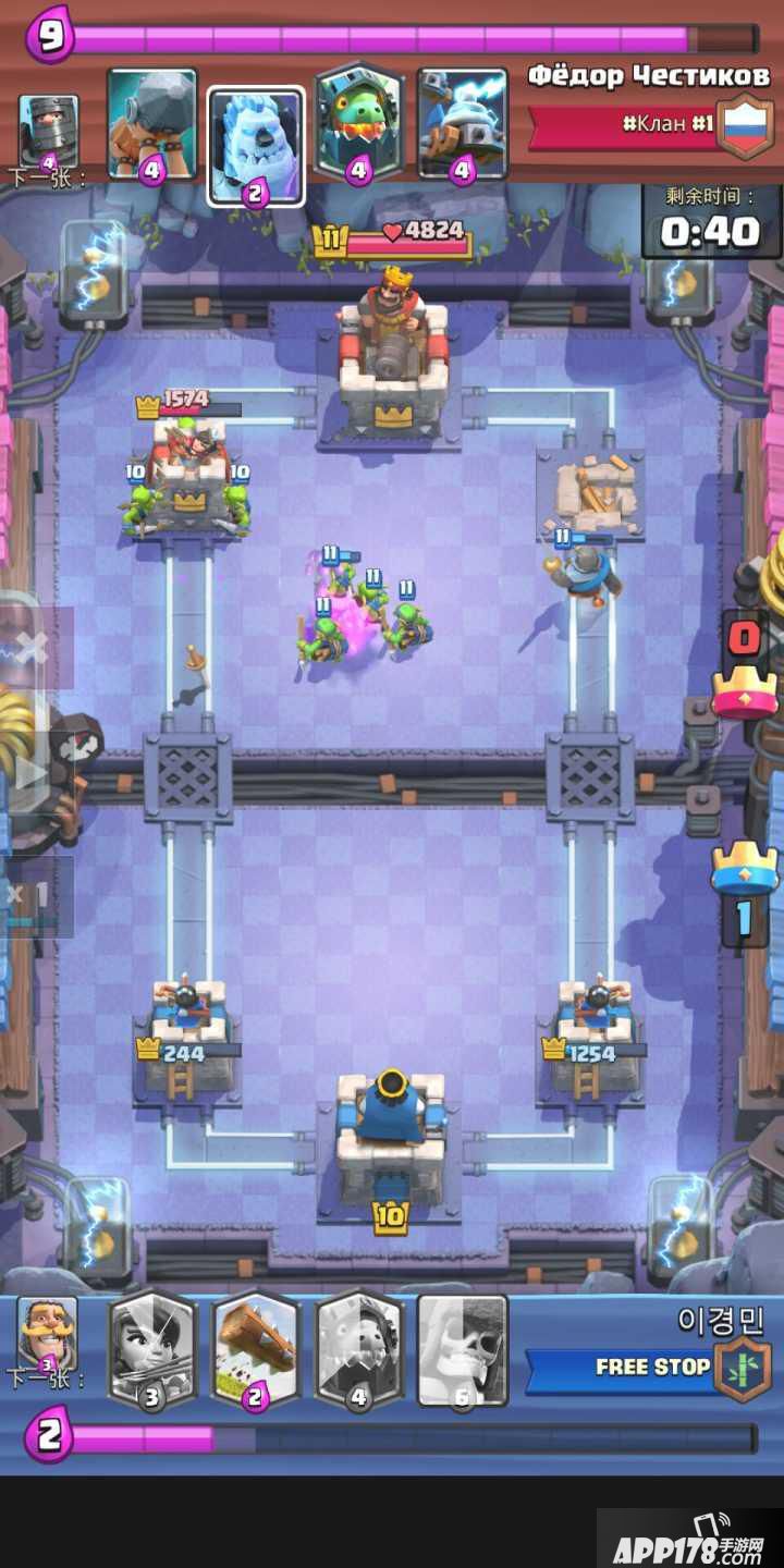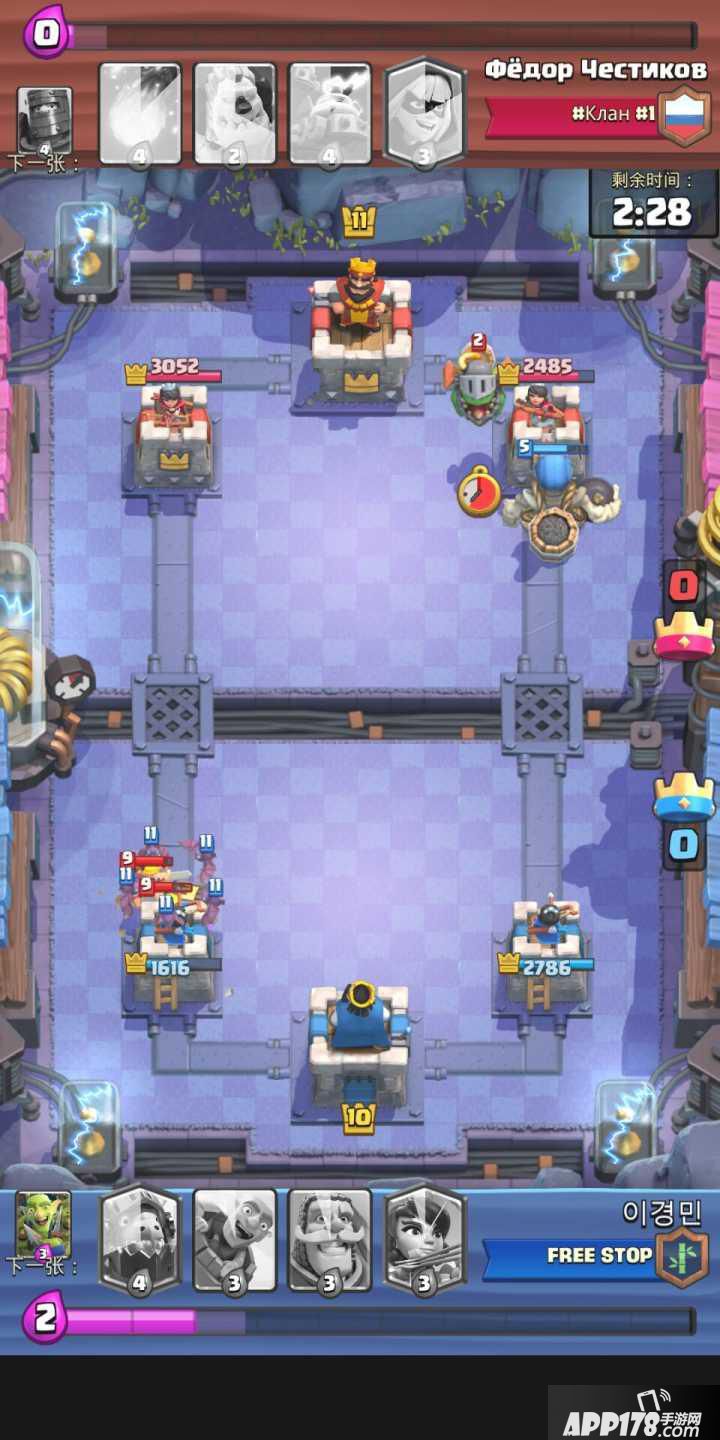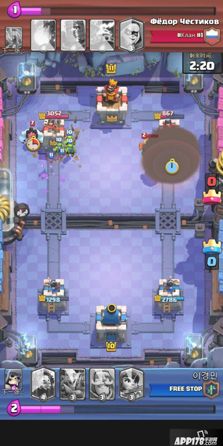 这个时间段对面一直在不停的骚扰我,与其说是骚扰,但是我只要有一次骚扰没有挡下来,我就可能会掉了一个塔,这里已经能推断出对面的卡组是一个十分典型的冲锋三件套黑王加攻城锤加幻影刺客非常的克制我这个卡组