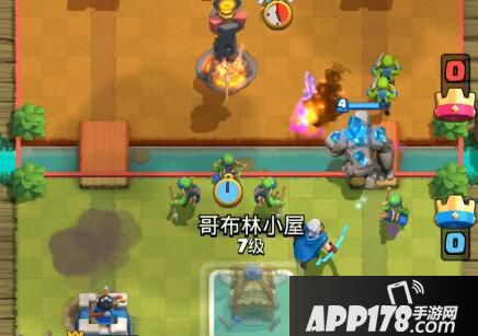 2、防守:由于本套卡组缺少圣水收集器作为圣水支撑,因此石头人在双倍圣水阶段前最好不要轻易使用,否则很容易被敌方使用野蛮人精锐、野猪等突进型兵种换路偷袭,得不偿失。建议前中期尽量以低费卡牌赚费解场为主,必要时可搭配火球、小电两张法术卡牌进行辅助防守解场,待防守完毕后继续下出哥布林小屋来不断消耗敌方公主塔血量。如果敌方前期亏费较为严重,就可以转守为攻,沉底石头人来打出一波强势的进攻。