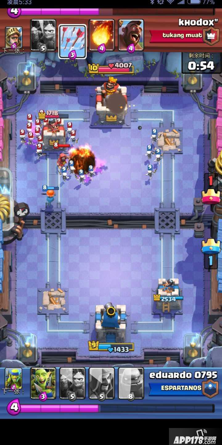大家看这里仅仅是依靠一个两费的小哥布林就成功的推掉了对面的一个防御塔,现在大家应该明白了为什么我先前说的主要输出不是火法的原因了吧,这里在破掉了对面右路防御塔之后,我在用屌丝群来对付王子,别看这些小屌丝不起眼他们防守能力可是非常的强的,对面法术多又怎样,我的杂碎群比被对面的法术更多