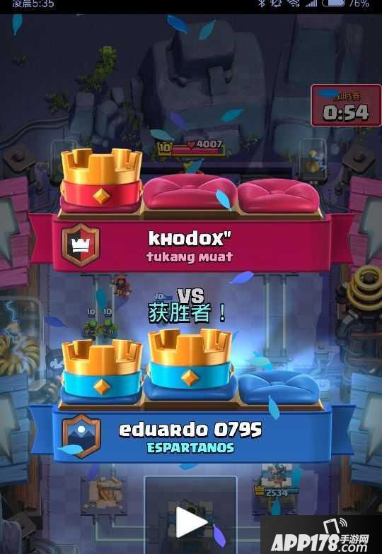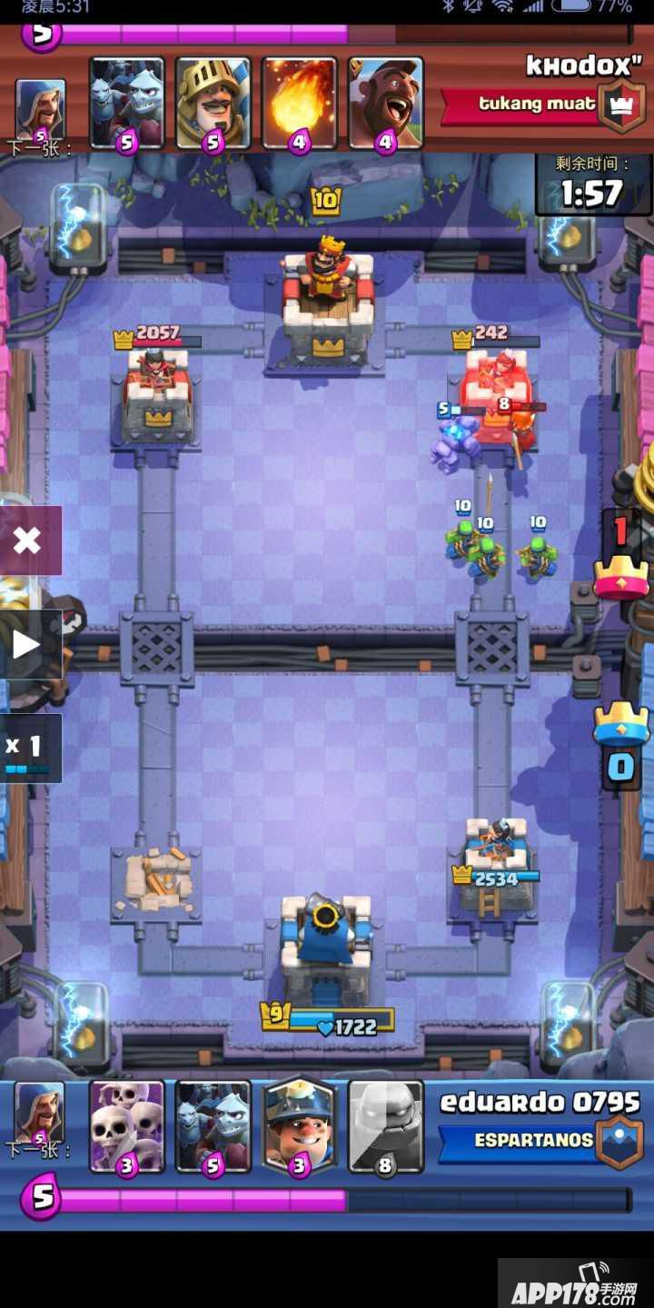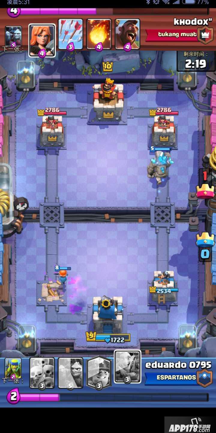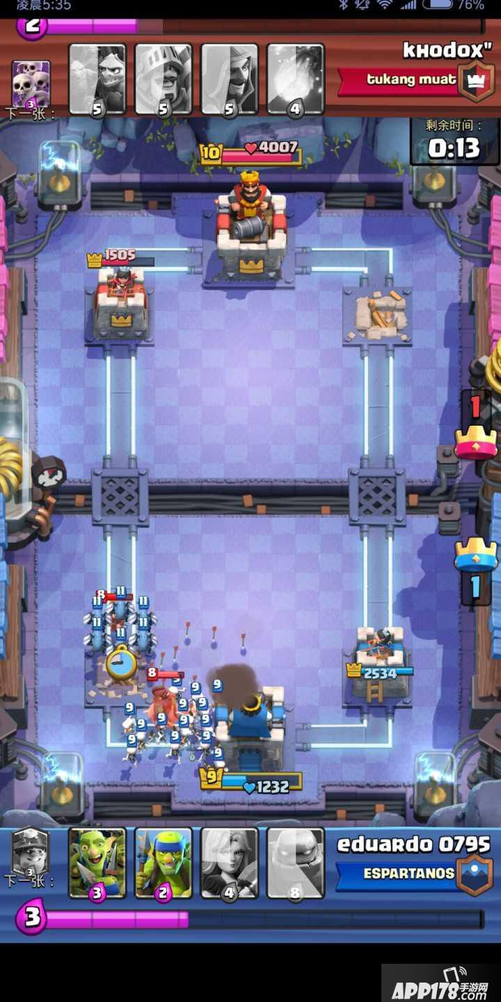 这里我根本没有进行防御,只是下了一个火法稍微抵挡一下,因为我十分自信我的卡组的进攻能力,只要石头人到了对面防御塔面前最次我也能推掉对面一个防御塔