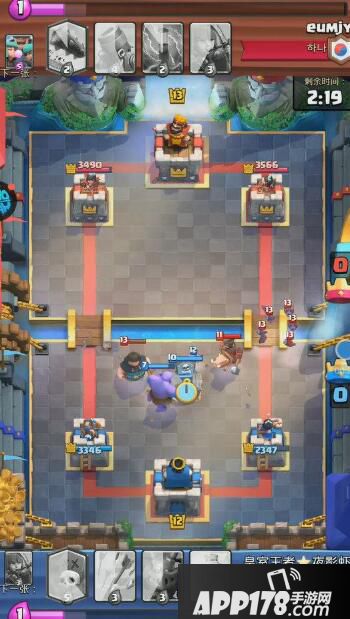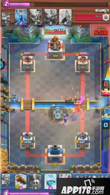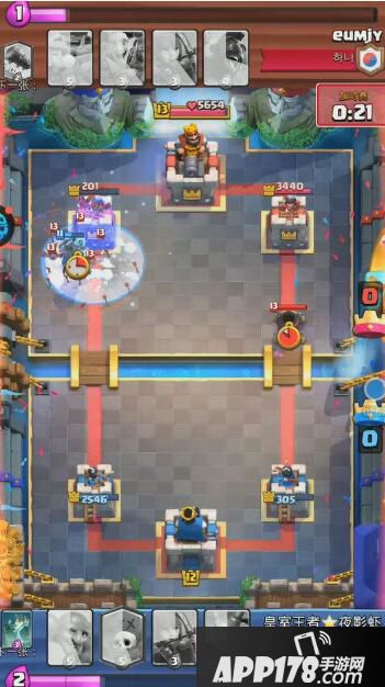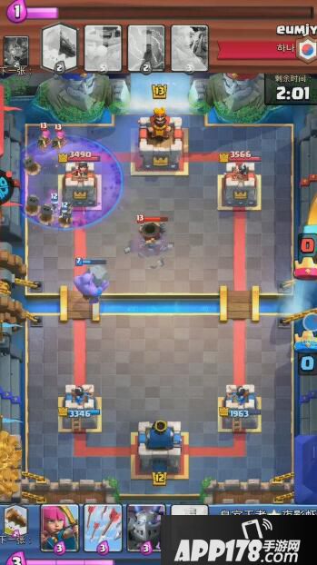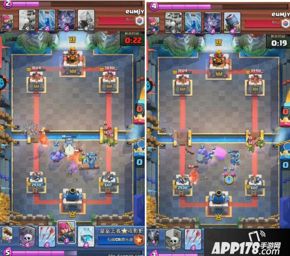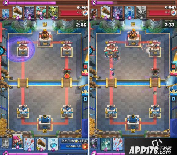 解析:蓝方四法术起手卡序太差,第五张卡牌也不是蓝胖子。对手下出迫击炮以后强行防守只会吃力不讨好,只能尝试对攻。还有一个选择就是中间下出墓园,但是有风险,迫击炮如果锁定了防御塔这一局就凉了。