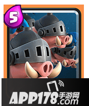 玩法分析:皇家野猪是最新推出的卡牌,这张卡在属性上和野猪有很多相像的地方,都属于机动性很强的消耗兵种,但是使用上会有较大区别。皇家野猪在费用上需要5点圣水,属于一张中费的兵种。同时数量上也高达4个单位。人海的皇家野猪能够快速包围敌军防御塔造成破坏,集中的输出能力很强。由于数量上有优势,根据战况可以一路集中进攻,也可以在桥中间分路游击对手两路防御塔。