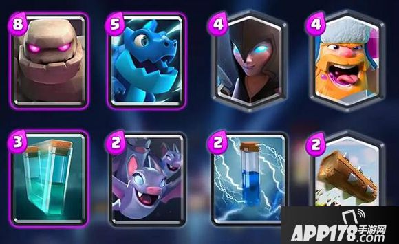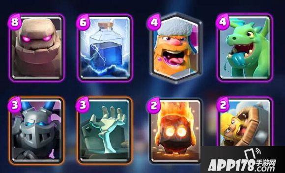 Royal这套石头人,放弃了带上飓风的三法术,也没带电龙这张高费后排,过牌更加平滑,费用也不那么卡手,但对使用者的操作要求更高。如何在防守时将火豆豆、滚筒、墓碑、机甲4张牌的威力发挥到最大,决定着石头人整场的节奏。