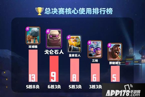 纵览全球总决赛的核心卡牌使用率,功能全面和重装推进型卡组成为选手们的最爱。攻城槌(皮卡槌和黄毛房子槌为主)虽然使用率高居第一,但胜率却有点感人。而重推之王石头人,则一跃成为总决赛最火爆的核心——登场9次高居第二,胜率达到惊人的66.7%,尤其Royal这套皇家石头人,更是3战3胜轰出100%胜率。
