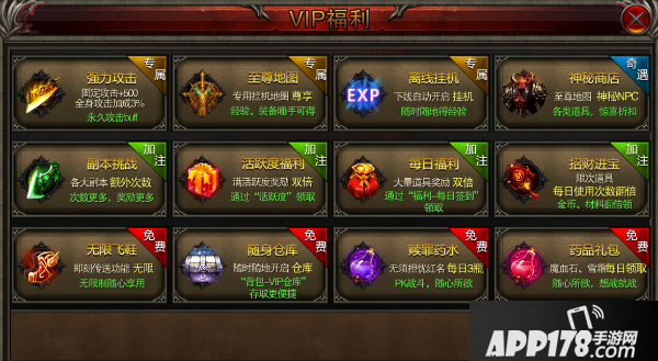 首先我们看看至尊VIP的福利,界面一打开,满屏的福利亮瞎了我的钛合金狗眼!不论是提升属性还是各种福利一应俱全,不充个至尊VIP怎么能痛快?多搬几块砖的事而已,GO GO GO!