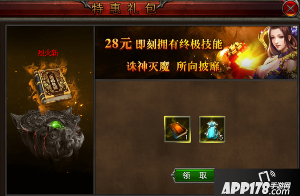 接着就是终极技能。传说中PK时能把对方一刀秒杀的烈火斩只需28元,这价格让小编心里痒痒的,虽然性价比没有至尊VIP的高,但烈火斩这种居家旅行杀人抢Boss必备的技能实在太吸引,咬咬牙一块买了!