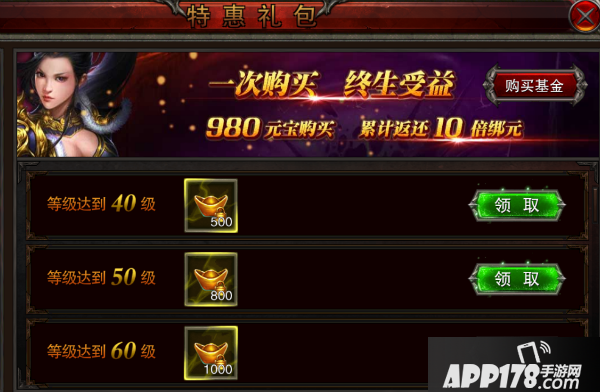 然后再到成长基金,这个我倒是觉得可有可无,毕竟对战力影响不大,不过收益10倍这点对以后的游戏有较大的影响,打算长期玩下去的玩家可以关注~
