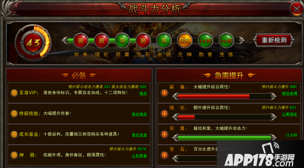 点开后会弹出战斗力分析的界面,是强是弱一目了然。小编我仔细一看,幸好战斗力还有43,不至于是战5渣,但在好几个方面都急需提升。我们逐个点进去看看。
