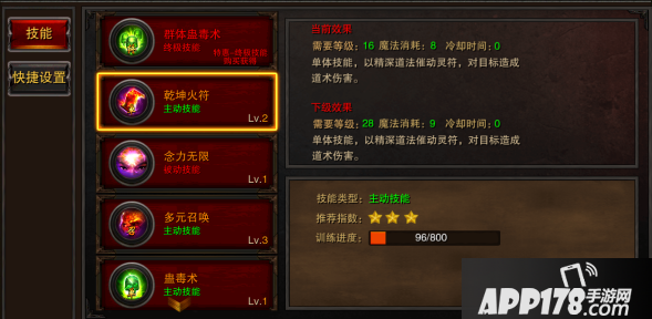 然后要介绍的是道士为数不多的输出技能——乾坤火符。蛊毒术严格来说只是一个debuff,真正的输出还是得靠火符。你说重要不重要?