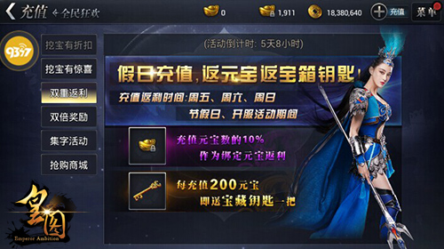 此外,《皇图》五一劳动节狂欢盛典还为勇士强者们带来了充值返利的特惠活动。在活动期间,充值即可以获得充值元宝数5%的绑定元宝返还;而每充值200元宝,便可以获赠一把宝藏钥匙。充值越多,能够获得的返利就越丰厚,将狂欢进行到底!