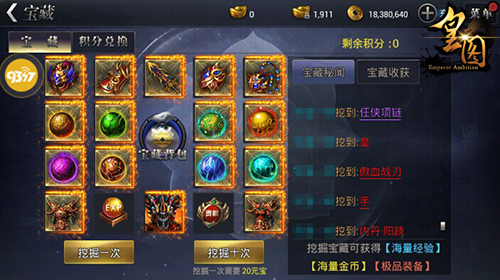 神装在手,天下我有!在五一劳动节狂欢盛典期间,《皇图》挖宝勇士们将会有概率得到“威震天下”系列的神装神器,成就强大的战力。同时,活动期间挖宝还可以获得“皇”“图”“手”“游”“狂”“欢”“庆”“典”这八大字帖,用来兑换100、1000甚至10000元宝的大礼!