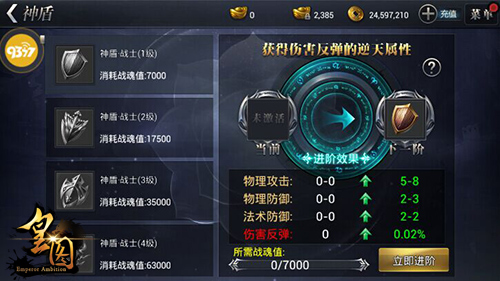 不灭战魂,成就逆天神盾!在《皇图》当中,神盾装备的打造以及升级都需要消耗大量的战魂值,而勇士强者们目前获得战魂值的主要途径包括完成跨服日常副本任务、参与跨服乱世竞技场、商城购买战魂丹以及参与跨服攻城战。等级越高的神盾,能够带来的属性加成就越多!