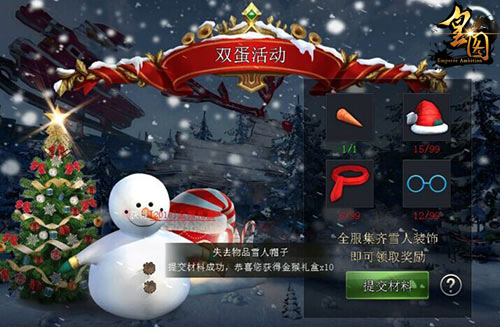全民动手堆雪人,圣诞大使送壕礼!在《皇图》此次跨年的双蛋活动期间,皇城的勇士强者们只要共同努力,成功集齐雪人的帽子、鼻子、围巾以及眼镜这4个装饰部位,均可在“长安-圣诞大使”处领取百分百全民暴击BUFF和圣诞袜子礼物!而在提交装饰材料的同时,还能获得金猴礼盒的奖励!
