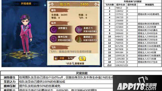 阡陌老师作为一个强力的辅助灵宠,灵宠飞升属性加成角色生命值非常可观。并且阡陌老师灵宠拥有着强大的辅助技能,尤其是他的圣君之力技能,给队友提供100%的伤害加成,这可以让战斗的胜利几率大大提高!
