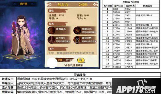 3、流火涅槃:造成169%攻击力的伤害和晕迷。死亡后80%几率复活(复活次数随飞升等级增长而增长,分别是3、6、9、12),复活增加50%伤害。