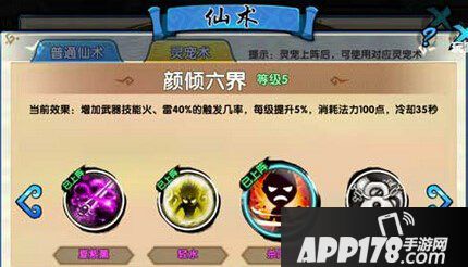4、灵宠术颜倾六界(满级):增加武器技能火、雷20%的触发几率,每级提升5%,消耗法力100点,冷却35秒。