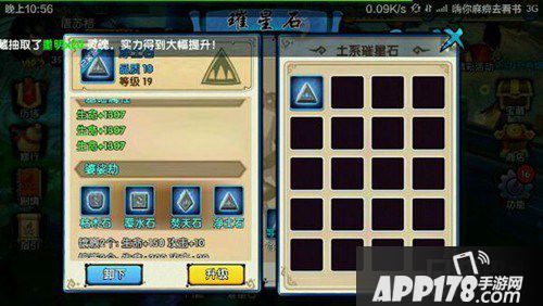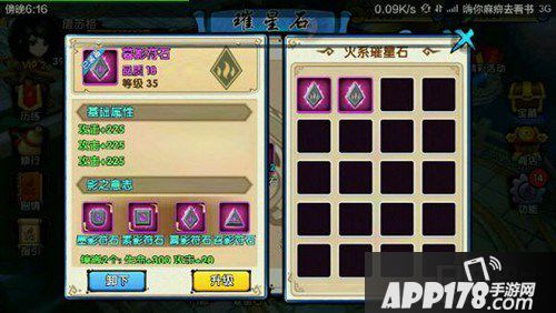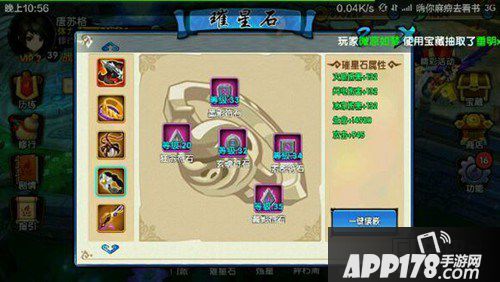 如下图,当然还有系统送的影系紫色石头也是。当然了,璀星石分为金木水火土,所激活的效果也不尽相同,建议大家按照自己想要的属性自己选择升级。【按个人口味自行加减】ps:中间的石头很强力!一般人我不告诉他!提高璀星石等级最好选用经验石。