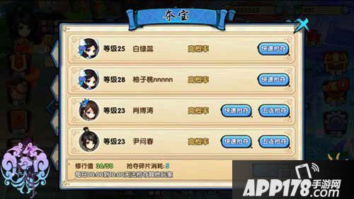 点击抢夺按钮过后,系统将会弹出宝物抢夺界面。在抢夺界面上可以看到拥有这些宝物的对手。