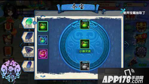 大家点击游戏操作界面左侧的修行按钮,在弹出的系统菜单中,选择“夺宝”进入系统操作界面。