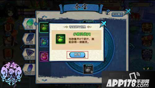 操作界面中间的图标代表所要抢夺的道具,可以点击图标查看这个道具的详细信息。在道具图标的周围,就是我们要抢夺的道具碎片。大家还要注意一点呢:已经获得的道具碎片的图标是彩色的,尚未获得的道具碎片的图标是黑白颜色的。大家可以选择需要的道具碎片,然后再点击碎片图标可以查看碎片的信息,并点击抢夺按钮。