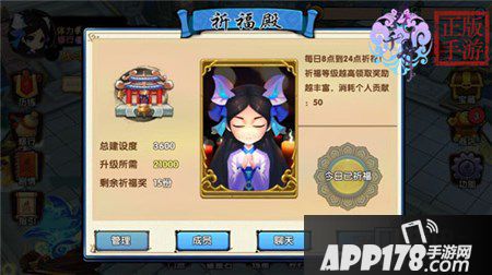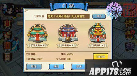 门派的发展壮大需要所有门派成员的共同努力,门派掌门用游戏货币升级门派可以提升建设度,而个人在门派里的相关捐献也是会得到个人贡献度的,贡献度在门派内的祈福殿是可以兑换各种福利的哟。 在门派宝阁内,玩家可以使用个人贡献兑换一定数量的道具,商城等级越高,可兑换的道具价值越高。各位童鞋若是想把自己的门派建设的更好,那就把门派所有成员号召起来吧,团结一心,将门派发扬光大!门派越壮大,可以获得的游戏福利也越豪华哟!