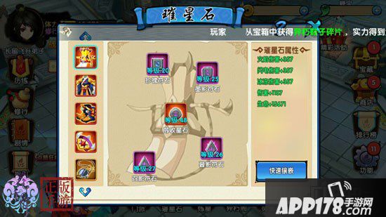 在升级璀星石的过程中有哪些技巧呢?建议大家可以按照一定的顺序来进行升级,璀星石有增加伤害和生命属性两种不同类型。如果大家想快速通关历练副本,攻击力是一个重要因素,人物角色的攻击伤害值越高,打怪的速度也就越快,通关历练副本的速度也就越快。因此可以先将增加人物角色攻击力值比较多的璀星石进行升级。