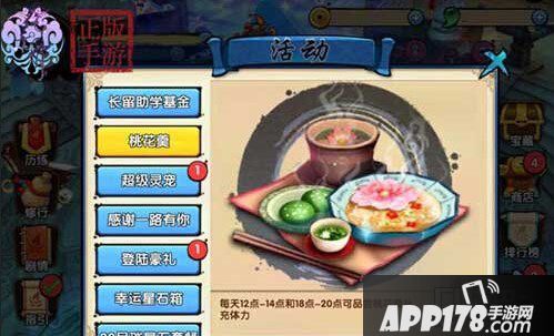 2、每日12:00——14:00和18:00——20:00在这两个时间段内可以通过桃花羹活动领取体力值,体力是增长人物角色经验的要素,有了更多的体力值就可以进行更多次数的历练副本扫荡,获得更多的角色经验。