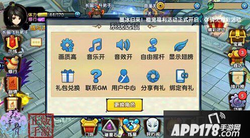 玩家可在游戏屏幕右方“功能”按钮中打开“系统”进行系统选项设置。“系统选项”中可以设置画质的高低,调节音乐、音效的开关。还可以改变遥感的状态,更方便的是,可以返回登录切换角色。