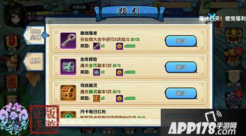 日常任务和悬赏任务只需要点击左侧的(指引)按键就可以打开任务列表。比如这个通关副本的任务,点击战斗就可以进入对应关卡的选择界面:
