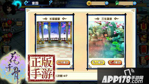 家园系统一共分为三生温泉与长留盛宴模式,每个模式又分为私人模式和公共模式。玩家们不仅可以通过私人模式邀请自己的好友参加长留盛宴或者是三生温泉。而且还可以通过公共模式邀请其他不是自己好友的玩家,这样极大的提高了游戏玩家之间的社交互动性,让玩家们能够在游戏中认识更多的朋友,给玩家带来更多的欢乐!
