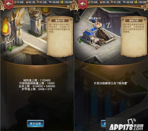 城门是领主驻扎守城士兵和放置陷阱的地方,提升城门的等级会提高城防值和放置陷阱的容量。在防守时,城门是我们的第一道防线,可阻挡一段时间内敌方近战士兵的攻击。