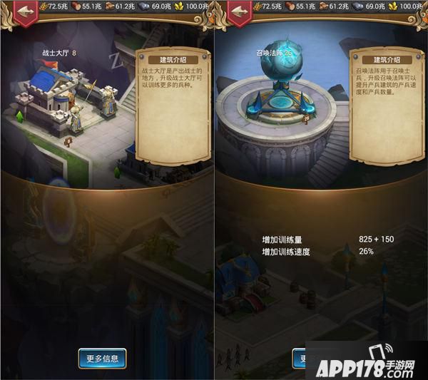 作为第二资源顺位的兵营生产影响着你战斗出征的成功率,兵营建筑有战士大厅、游侠营地、法师塔和巨兽巢穴,是影响士兵战斗力的重要建筑。升级设施可以增加生产士兵的数量和解锁更新更厉害的兵种,也会影响士兵的强度。而召唤法阵相信也不用多介绍啦,用升级来换取单次的士兵训练量,提高产能与兵营生产建筑相辅相成。