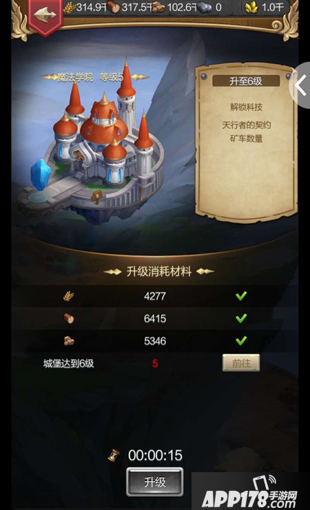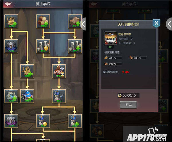 每项科技研究都需要前置科技的开发等级至少为1,才能开始研究下一级科技等级,每向下一层所需要魔法学院等级提高一级,魔法学院升级则需要基础资源和城堡等级。科技升级需要消耗不等的木材、粮食、石头和铁,科技等级越高,所需材料越多。