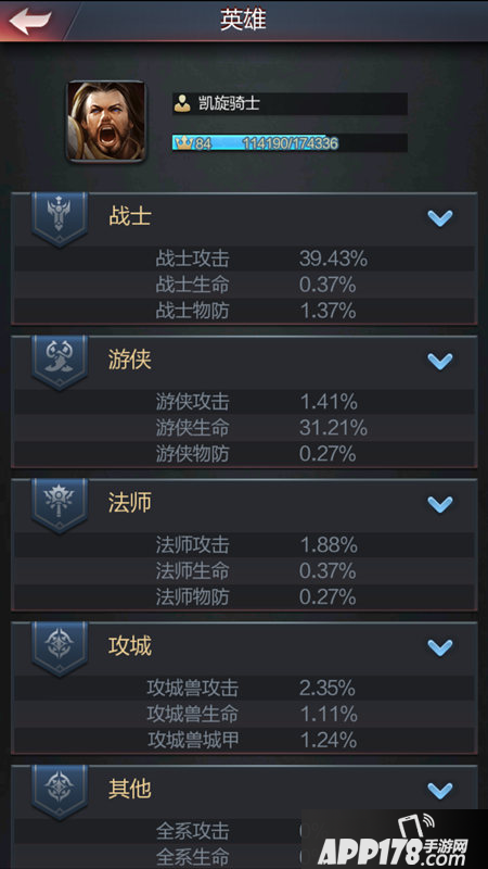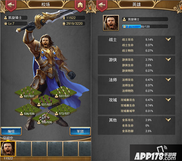 介绍完兵种的属性和产出,接下来说说兵种的增强方法。首先大家要清楚,全部兵种都不能通过自身升级来增加属性,必须统一通过领兵英雄战斗属性强化。英雄的战斗属性均为增加百分比,升级装备、学习技能都可以提高战斗属性,英雄的战斗属性将直接影响所带领部队的实战强度。