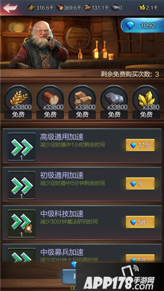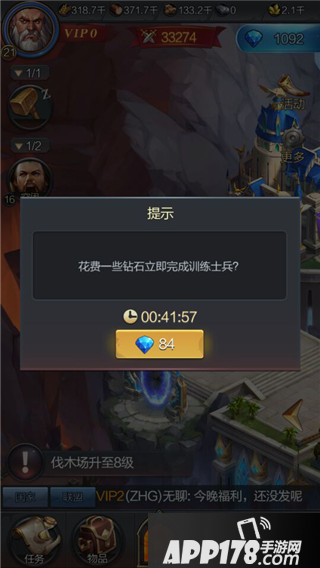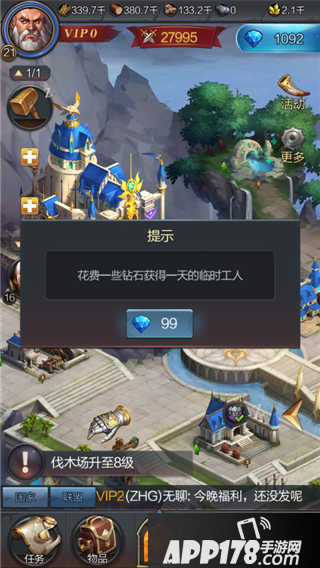 当然,光有工人还是不够的,因为工人干活还是会干累的啊!这时,你又要考虑该不该花钻石来立刻消除他们的疲劳感。对于这个问题,还是得到表哥的肯定的,因为“时间就是金钱,朋友”。而且前期的消除花费还是比较人性化的,越高级的建筑消除疲劳所要消耗的钻石就越多...越多...多!所以在前期把建筑等级先推上来是比较明智的选择,也能拉开其他玩家一段距离。