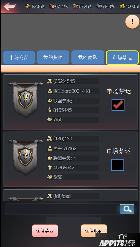 (7)贸易禁运:玩家A将指定联盟加入到自己的贸易禁运黑名单后,则该联盟所有成员玩家都不能与玩家A进行市场贸易买卖。A也不能到贸易禁运的联盟所有成员的市场进行贸易买卖。