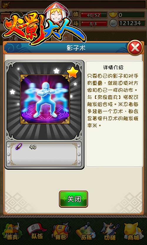 忍术忍书介绍了游戏中各忍者的特有忍术技能,除了让大家有原汁原昧的动漫剧情感觉,不同的忍术可激活不同忍者的配缘增强忍者属性,同时不同的忍术可造成的伤害不同,并且战斗过程中会呈现不同的技能动画。