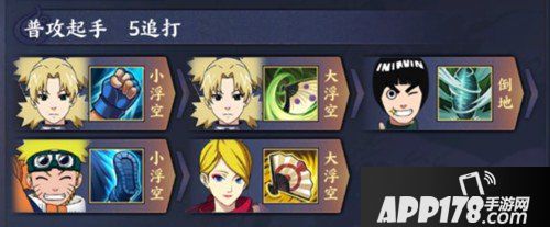 这个阵容可以做到5次追打,我们先从手鞠起手,先两次浮空,然后小李倒地,鸣人可以继续进行浮空,最后风主大浮空收尾。多次追打可以做到一个回合能够拥有很高输出,虽然一次性输出不高,但是多次追打就能够有很好的效果,比较适合打BOSS。