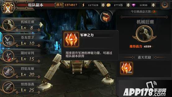 玩家通关普通副本2-3后即可开启组队副本玩法,通关组队副本可以获得大量的军神之力(用于升级军神)。