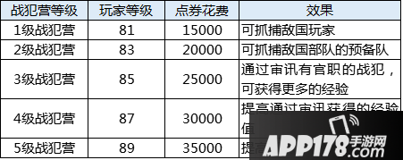 战犯营建设需要使用点券,建成五级战犯营共需点卷12.5万